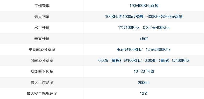 侧扫声呐的工作频率通常为几十千赫到几百千赫,声脉冲持续时间小于1毫秒,仪器的作用距离一般为300~600米,拖曳体的工作航速3~6节,极限可达16节。